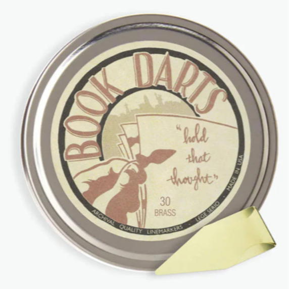Brass Book Darts are precision-cut, paper-thin metal line markers that attach easily to any page, without harming the paper. To use, place the Book Dart at the desired line, close the book and press down on it. As elegant as they are practical, Brass Book Darts come in a classic round metal tin that will bring a note of vintage charm to your desk or bedside table.