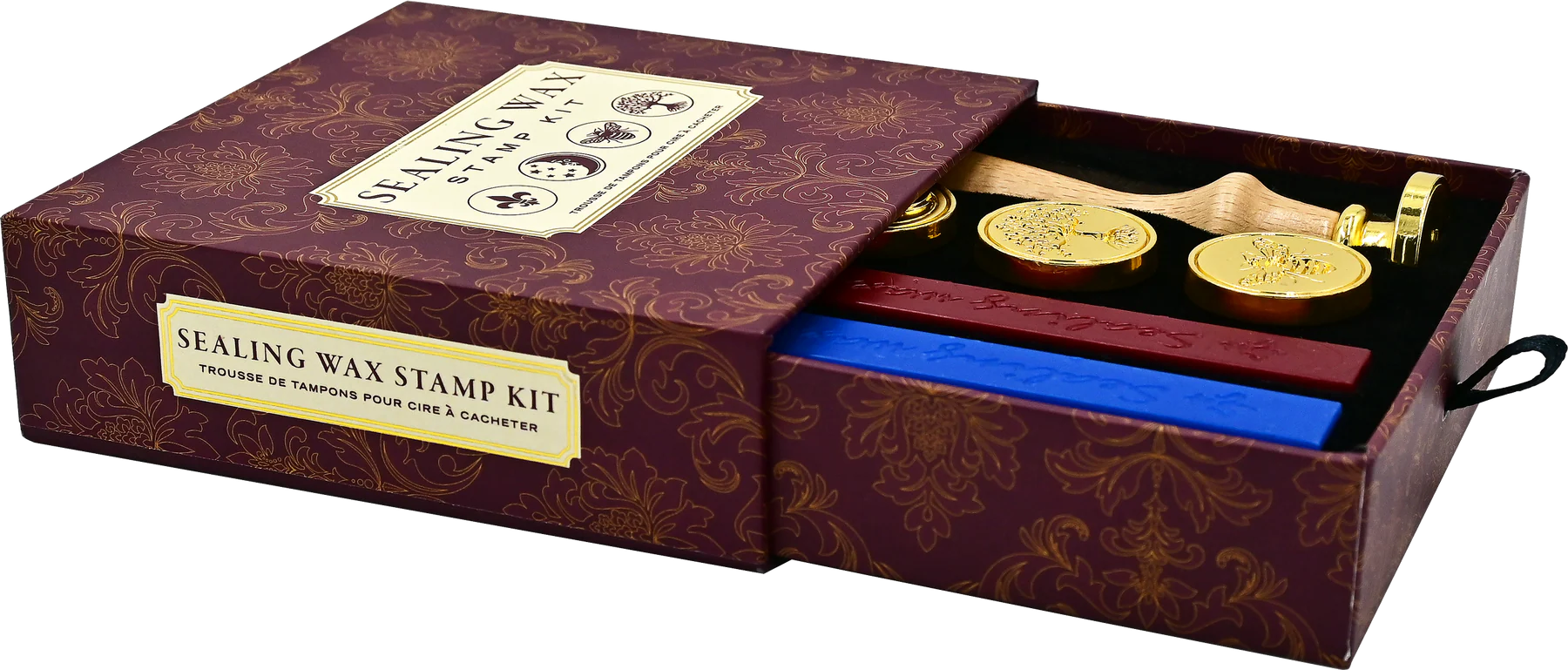 Includes four unique brass seal stamps, one wooden handle, and two wax sticks.